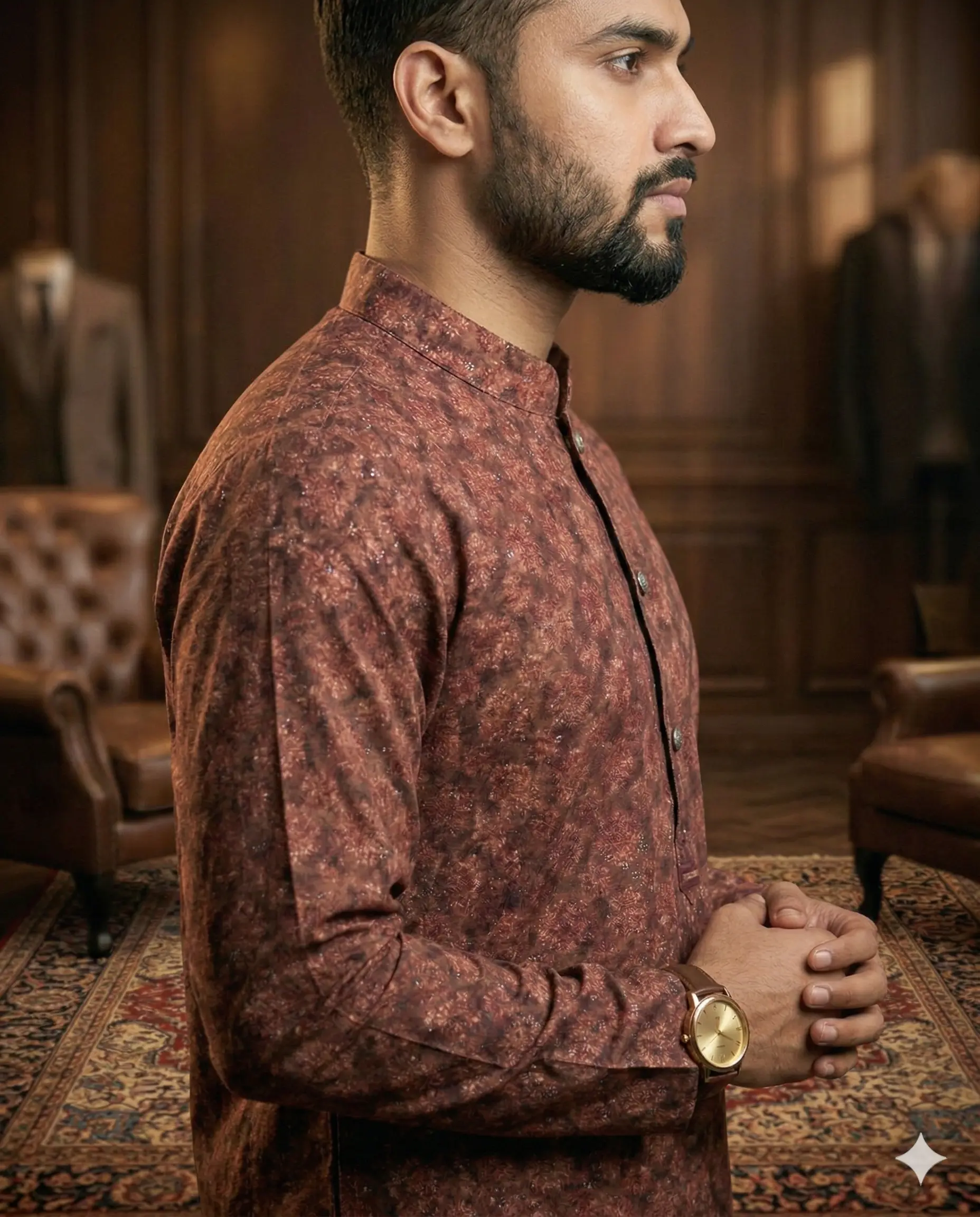 মিনিমালিস্ট ডিটেইল: এতে রয়েছে সূক্ষ্ম ম্যান্ডারিন কলার এবং ক্লিন প্লাকেট ডিজাইন, যা একটি আধুনিক লুক বজায় রাখে।