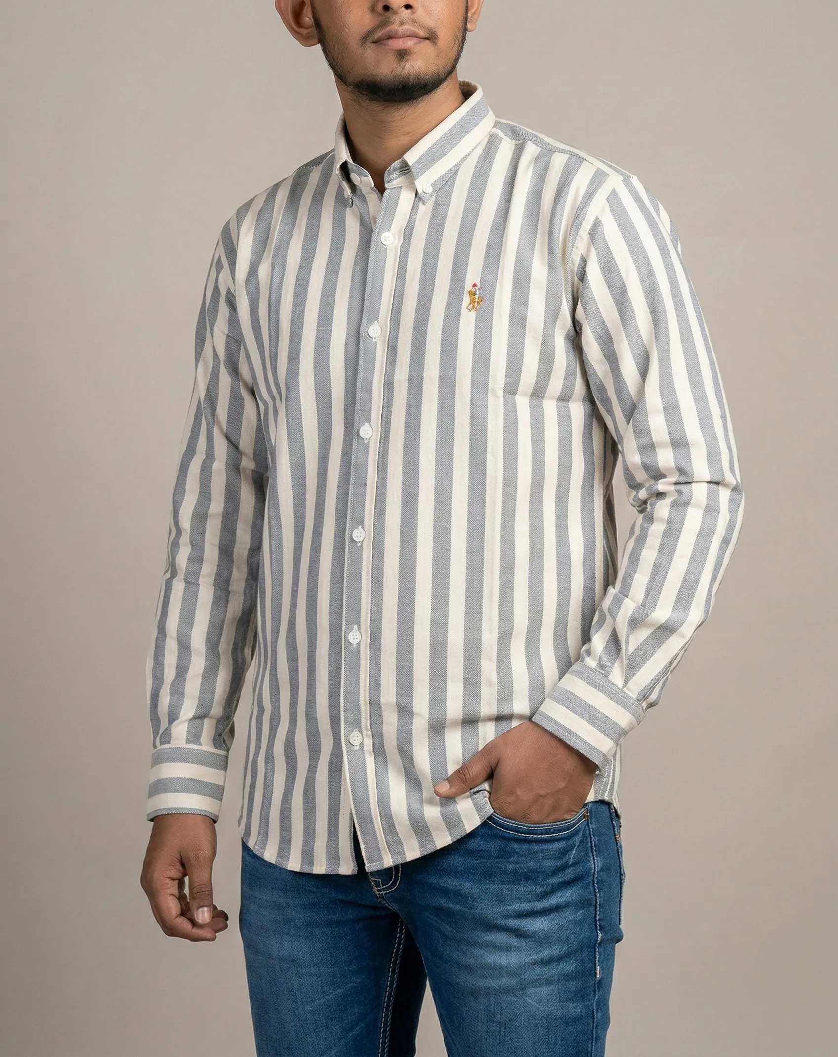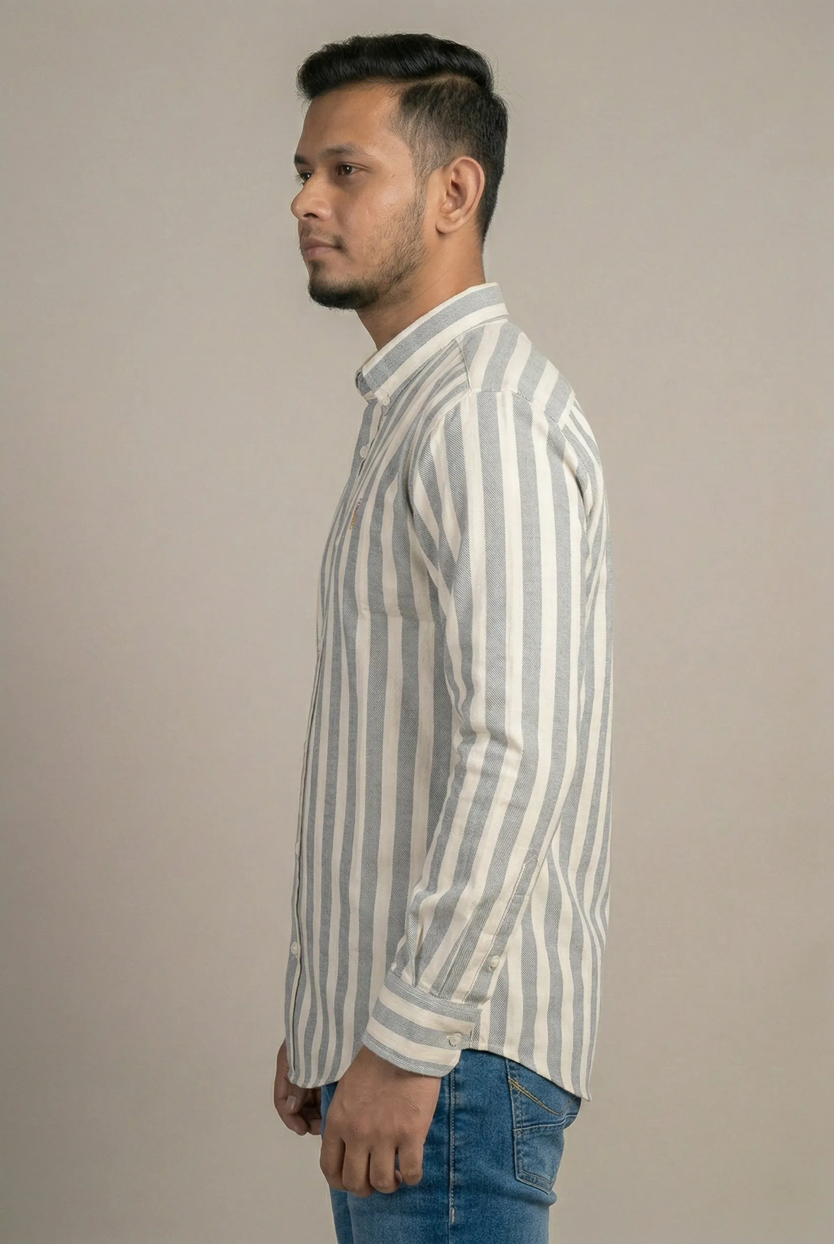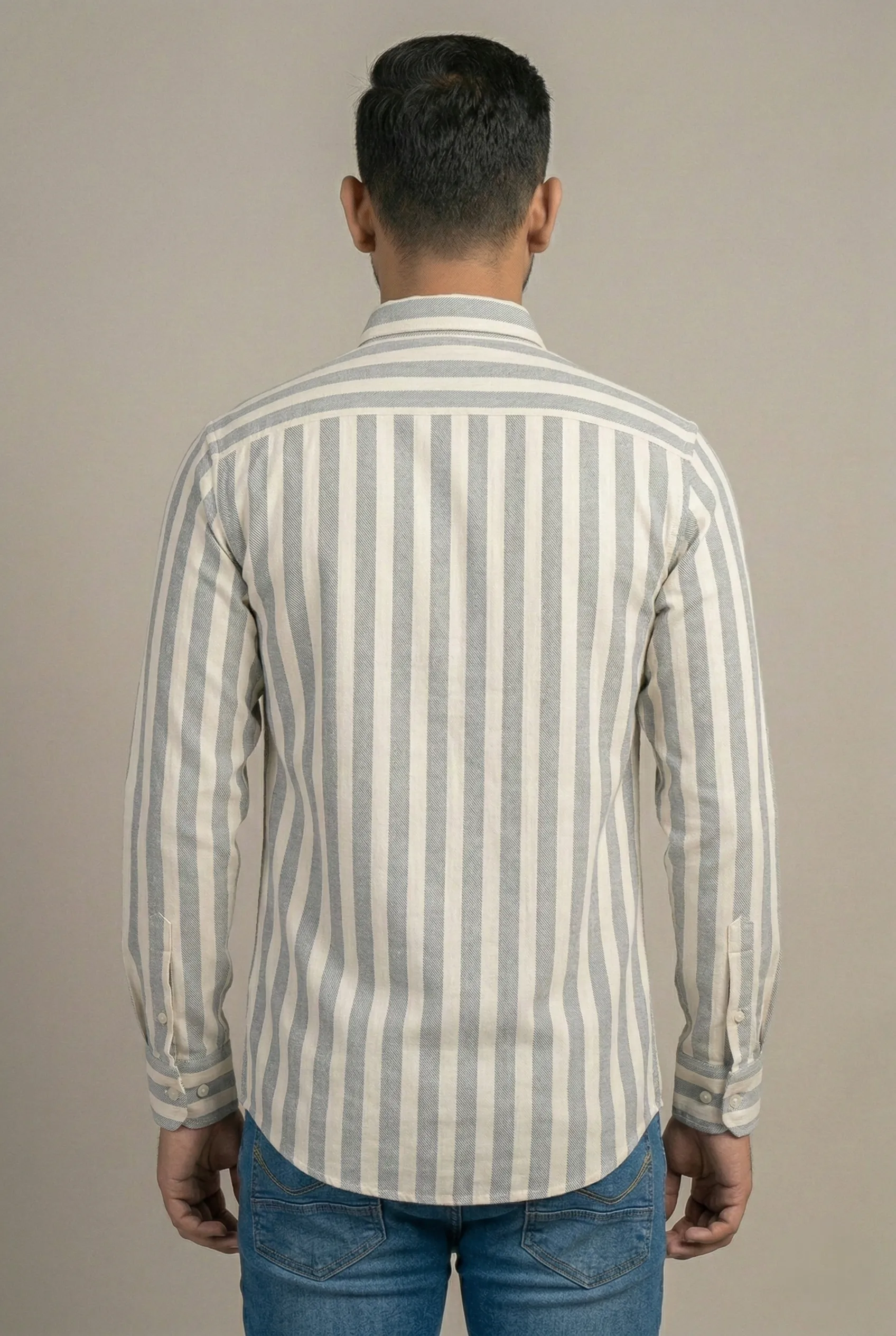 এই শার্টটির প্রধান আকর্ষণ হলো এর Vertical Stripe বা লম্বালম্বি দাগের ডিজাইন। এর কালার কম্বিনেশনটি বেশ সফিস্টিকেটেড; এতে সাদা (White) বেইজের ওপর Steel Blue বা Muted Blue রঙের স্ট্রাইপ ব্যবহার করা হয়েছে। এই ধরনের স্ট্রাইপ শার্ট শরীরকে কিছুটা পাতলা এবং লম্বা দেখাতে সাহায্য করে, যা একটি স্মার্ট লুক দেয়।